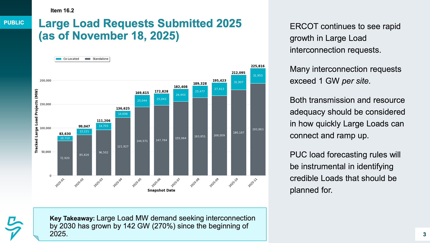Large load queue hits 225 gigawatts with no signs of slowing down; PUC staff files discussion draft on large load interconnection; ERCOT board to consider more extra high voltage transmission.