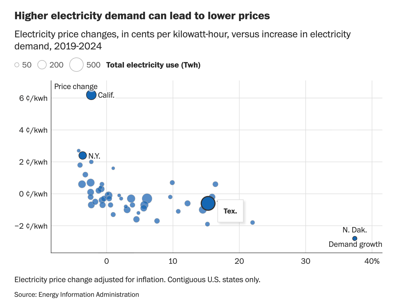 North Dakota, for example, which experienced an almost 40 percent increase in electricity demand thanks in part to an explosion of data centers, saw inflation-adjusted prices fall by around 3 cents per kilowatt-hour. Virginia, one of the country’s data center hubs, had a 14 percent increase in demand and a price drop of 1 cent per kilowatt-hour. California, on the other hand, which lost a few percentage points in demand, saw prices rise by more than 6 cents per kilowatt-hour.